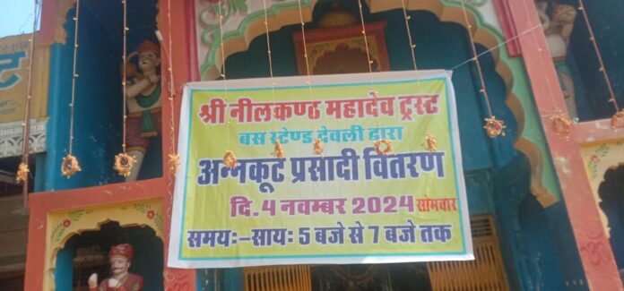 Deoli News 1 नवंबर (दैनिक ब्यूरो नेटवर्क) श्री नीलकंठ महादेव मंदिर ट्रस्ट बस स्टैंड देवली की ओर से आगामी 4 नवंबर को अन्नकूट प्रसादी वितरण कार्यक्रम होगा।