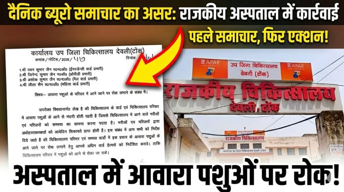 Deoli News 23 अप्रैल (दैनिक ब्यूरो नेटवर्क) स्थानीय उप जिला चिकित्सालय में आवारा पशुओं के प्रवेश और उससे फैलने वाली गंदगी को लेकर दैनिक ब्यूरो में खबर प्रसारित होने के बाद अस्पताल प्रशासन ने संज्ञान लिया है।