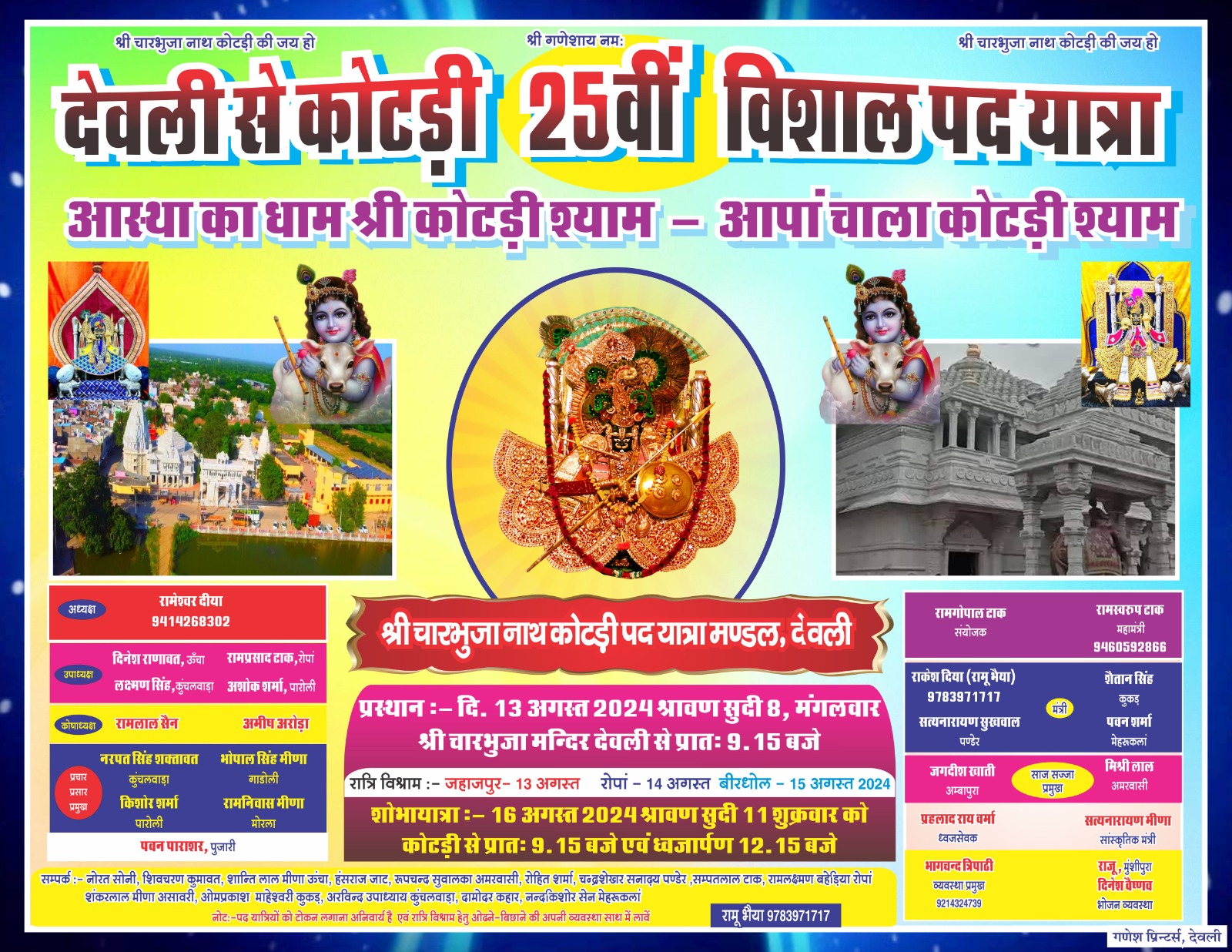 Deoli News 26 जुलाई (दैनिक ब्यूरो नेटवर्क) देवली से कोटडी स्थित श्री चारभुजानाथ मंदिर जाने वाली 25वीं पदयात्रा इस बार 13 अगस्त को रवाना होगी। इसे लेकर शुक्रवार को पदयात्रा समिति के पदाधिकारी ने भगवान गजानंद को निमंत्रण दिया।