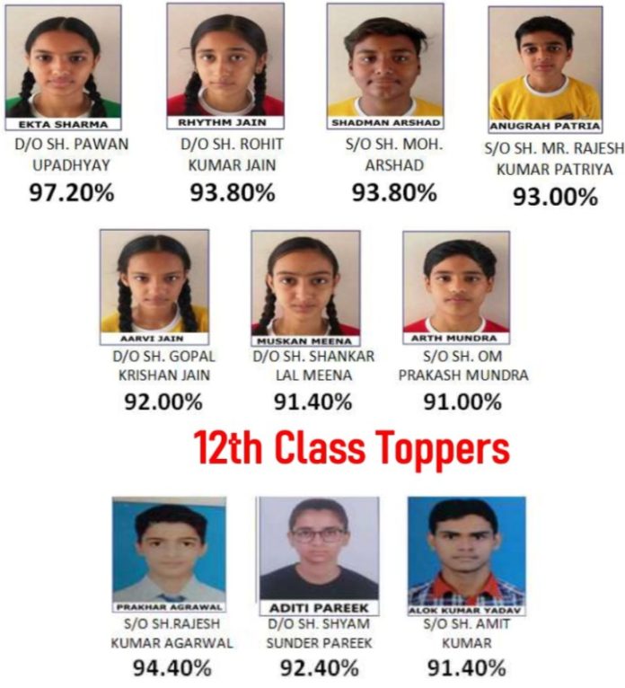 स्कूल निदेशक मोहित अग्रवाल ने बताया कि कक्षा 10 की एकता शर्मा पुत्री पवन उपाध्याय ने 97.20 प्रतिशत अंक प्राप्त कर स्कूल का नाम रोशन किया है। इसी तरह रिदम जैन पुत्री रोहित कुमार जैन ने 93.80, सद्दाम अरशद पुत्र मोहम्मद अरशद ने 93.80, अनुग्रह पत्रिया पुत्र राजेश कुमार पत्रिया ने 93 फीसदी, आरवि जैन पुत्री गोपाल कृष्ण ने 92, मुस्कान पुत्री शंकर लाल मीणा ने 91.40 एवं अर्थ पुत्र प्रकाश मूंदड़ा ने 91 फीसदी अंक प्राप्त किए हैं। इसी तरह कक्षा 12 में प्रखर अग्रवाल पुत्र राजेश कुमार अग्रवाल ने 94.40, अदिति पारीक पुत्री श्यामसुंदर पारीक ने 92.40 एवं आलोक कुमार यादव पुत्र अमित कुमार ने 91.40 अंक प्राप्त प्रशंसनीय सफलता हासिल की है।
