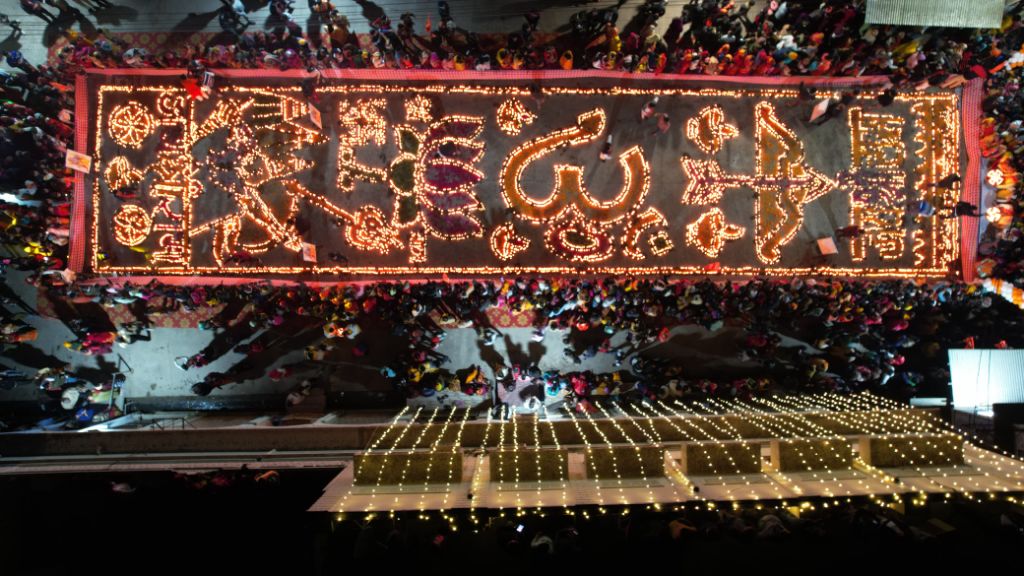 इसे लेकर शाम 6 बजे से आनंद चौक में लगाए गए 21 हजार को प्रज्वलित करने के लिए करीब 100 से अधिक महिला व पुरुष कार्यकर्ता जुटे। करीब एक घंटे की मेहनत के बाद 21 हजार दीपक प्रज्वलित किए गए। उत्सव में श्रीराम नाम, धनुष, राम मंदिर, ओम, कमल व त्रिशूल की आकृति दीपों के माध्यम से बनाई गई। वही स्टेज पर भगवान श्रीराम का आदमकद का कट आउट माल्यार्पण कर विराजमान किया गया। मौके पर कारसेवक दिनेश गौतम, तेजेन्द्र पारीक समेत ने भगवान श्रीराम के भजन गाकर लोगों में जोश में जुनून भर दिया। महिलाओं ने सामूहिक महाआरती की। हजारों लोगों की मौजूदगी में महादीपोत्सव में महाआरती की गई।