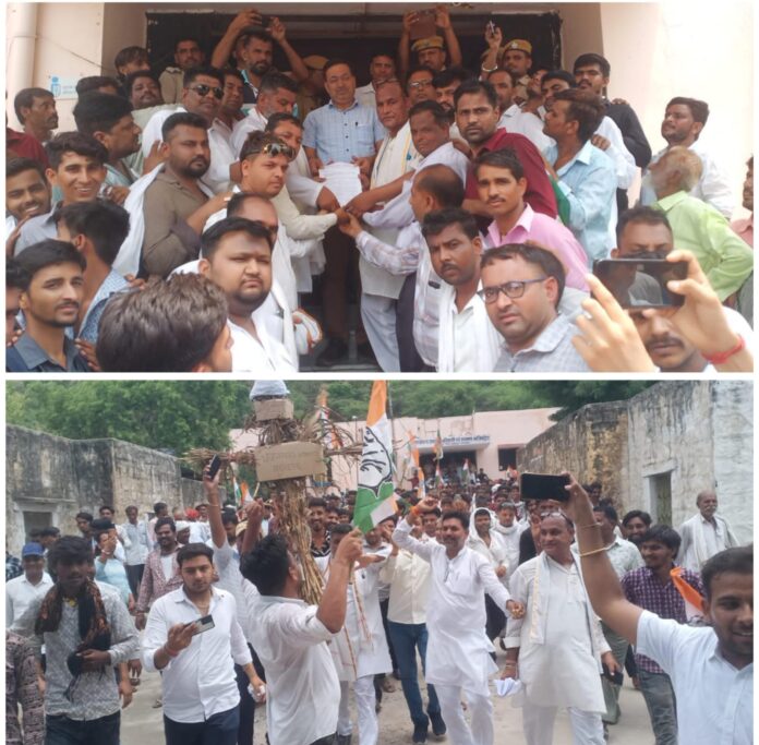 गौरतलब है कि कांग्रेस के राष्ट्रीय सचिव धीरज गुर्जर की मां जहाजपुर पंचायत समिति की प्रधान सीता देवी गुर्जर को ग्रामीण विकास एवं पंचायतीराज विभाग के अतिरिक्त आयुक्त एवं शासन उपसचिव ने आदेश जारी कर निलंबित कर दिया। इस आदेश को लेकर ब्लॉक कांग्रेस कमेटी के आह्वान पर सोमवार को सुबह से ही कांग्रेस के कार्यकर्ताओ ने मुख्यालय स्थित बाराह देवरा मन्दिर पर एकत्र होना शुरू हुए। सामूहिक रणनीति तैयार कर मन्दिर से आदेश के विरोध में भाजपा सरकार के खिलाफ नारेबाजी करते हुए सदर बाजार, बस स्टेण्ड होते हुए उपखण्ड कार्यालय पहुचे नारेबाजी कर विरोध प्रदर्शन किया तथा राज्यपाल के नाम ज्ञापन सौंपा। लोगों में आदेश को लेकर विरोध नजर आया।
