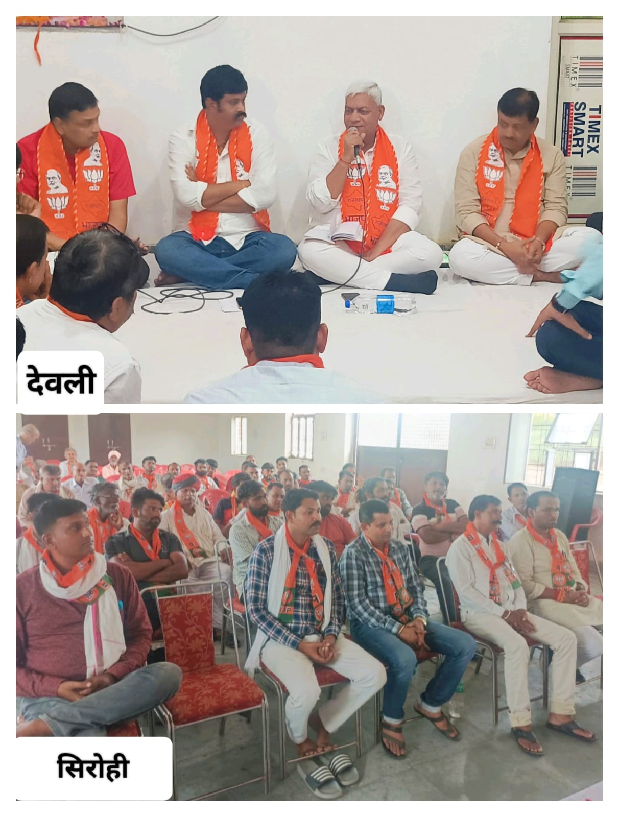 इसी प्रकार देवली देहात मंडल की बैठक सिरोही देहलवाल जी जाट धर्मशाला में हुई। भाजपा प्रदेश महामंत्री और भीलवाड़ा सांसद दामोदर अग्रवाल मुख्य वक्ता थे। विधानसभा प्रवासी प्रभारी वेद प्रकाश, मंडल विस्तारक मोहन सिंह मंडल अध्यक्ष सांवरिया बैरागी, पूर्व मंडल अध्यक्ष छीतर डागर, अजय सिंह थे। अग्रवाल ने कहा कि कार्यकर्ता उपचुनाव की तैयारी में जुट जाए। प्रत्याशी पार्टी तय करेगी। जिसे भी टिकट मिले, उसे जिताना है।