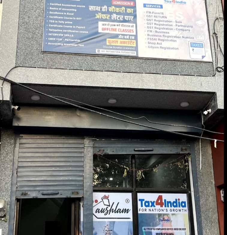 कंपनी की प्रबंधक दीप्ति आकाश कंछल ने बताया कि सुबह 11 बजे अतिथि द्वारका प्रसाद सिंहल व कमला देवी कंछल फीता काटकर कार्यालय का उद्घाटन करेंगे। इस दौरान कंपनी के सीईओ सुभाष बैसला भी मौजूद रहेंगे। उन्होंने बताया कि कौशलम कंपनी की ओर से सर्टिफाइड अकाउंटेंट कोर्स, बेसिक ऑफ अकाउंटिंग, एक्सीलेंस इन एक्सल, सर्टिफिकेट कोर्स इन जीएसटी, टीडीएस इन टैली पेरोल, इंटरव्यू स्किल्स आदि का प्रशिक्षण दिया जाएगा। इसी तरह टैक्स फॉर इंडिया की ओर से आइटीआर फॉर्म 16, जीएसटी रिटर्न, जीएसटी रजिस्ट्रेशन सोल, जीएसटी रजिस्ट्रेशन पार्टनरशिप, जीएसटी रजिस्ट्रेशन कंपनी, आईटीआर बिजनेस, बिजनेस रजिस्ट्रेशन नंबर, एफएसएसएआई रजिस्ट्रेशन, शॉप एक्ट, उद्यम रजिस्ट्रेशन आदि सर्विस भी मिलेगी।