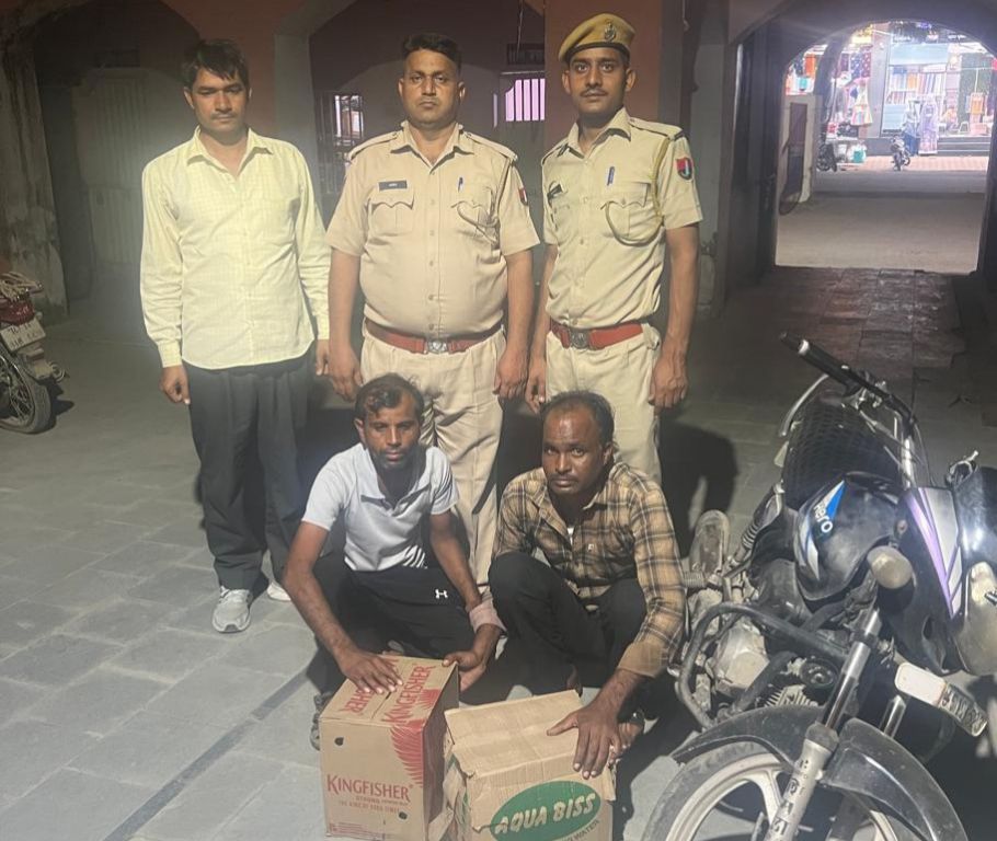 थाना प्रभारी राजकुमार नायक के अनुसार हेड कांस्टेबल सुरेश कुमार के नेतृत्व में पुलिसकर्मी गश्त करते हुए गणेश रोड शमशान घाट के करीब पहुंचे। जहां सामने की ओर से एक बाइक पर दो जने कागज के कर्टन के साथ नजर आए। जांच किए जाने पर दोनों के पास विभिन्न मात्रा की अंग्रेजी शराब बरामद हुई। जिसे जब्त कर पुलिस ने आरोपी दिनेश पुत्र भोमराज भांड निवासी भांड कॉलोनी देवली एवं कान्हा पुत्र प्रहलाद मीणा निवासी अंबेडकर कॉलोनी गणेश रोड थाना हनुमान नगर को गिरफ्तार किया है। जिनके विरुद्ध आबकारी अधिनियम के तहत मामला दर्ज किया गया है। पुलिस ने परिवहन में प्रयुक्त बाइक भी जब्त कर ली है।