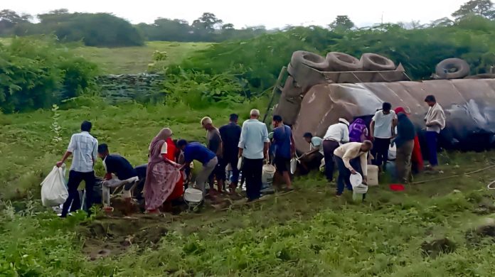 जिसे एकत्र करने के लिए सैकड़ो ग्रामीणों की भीड़ उमड़ गई। जानकारी के अनुसार निवाई से कोटा जा रहा यह मूंगफली का तेल का टैंकर (बिना फिल्टर) यहां गायत्री विहार कॉलोनी के पास अनियंत्रित होकर पलट गया। हादसे के बाद टैंकर से तेल बहने लगा। वही घटना के बाद मौके पर कोई चालक, खलासी नहीं मिला। तेल बहने की सूचना पर आसपास के ग्रामीण ड्रम, बर्तन, स्टील टंकी, केतली आदि, जिसे जो बर्तन मिला लेकर मौके पर पहुंचा और तेल एकत्र करने लग गए। सूचना पर हनुमान नगर थाना पुलिस के हेड कांस्टेबल प्रहलाद मौके पर पहुंचे और लोगों की भीड़ को हटाने की कोशिश की।