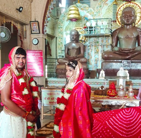जिसका विवाह जयपुर जिले के फुलेरा निवासी महावीर प्रसाद बड़जात्या की पुत्री भूमिका के साथ संपन्न हुआ। इस दौरान आंवा तीर्थ क्षेत्र में मूलनायक शांतिनाथ, पारसनाथ व आदिनाथ भगवान के सामने चक्रवर्ती जैन विवाह पद्धति से शादी हई। दूल्हे ने ना तो शेरवानी पहनी और न ही दुल्हन ने महंगे कपड़े। प्रथम भगवान का अभिषेक एवं शांतिधारा नवदंपति ने परिजनों के साथ किया। पं संजय शास्त्री ने बताया कि पुरातन काल में चक्रवर्ती विवाह होते थे। यह विवाह सबसे शुभ माने जाते थे। विवाह के साक्षी मूलनायक शांतिनाथ भगवान थे।