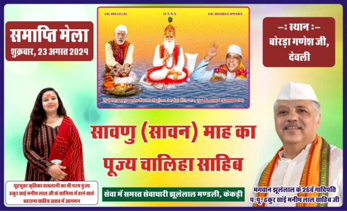 Deoli News 22 अगस्त (दैनिक ब्यूरो नेटवर्क) चालीहा साहिब समापन का कार्यक्रम शुक्रवार को बनास स्थित बोरडा गणेशजी मंदिर परिसर में होगा। यह आयोजन भगवान झूलेलाल के 26 वे वंशज साई मनीष लाल साहिब (भरूच गुजरात) के सानिध्य में आयोजित होगा।