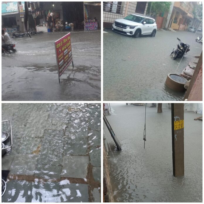 इनमें चर्च रोड में पानी नहर की तरह गुजरता दिखाई दिया। यहां सड़क किनारे स्थित केबिनों में पानी घुस गया। यही हाल देवली के ज्योति मार्केट के भी रहे जहां गली में पानी भर गया। इसी प्रकार छतरी चौराहा, गणेश रोड, घोसी मोहल्ला क्षेत्र में भी घुटने तक पानी का भराव हो गया।