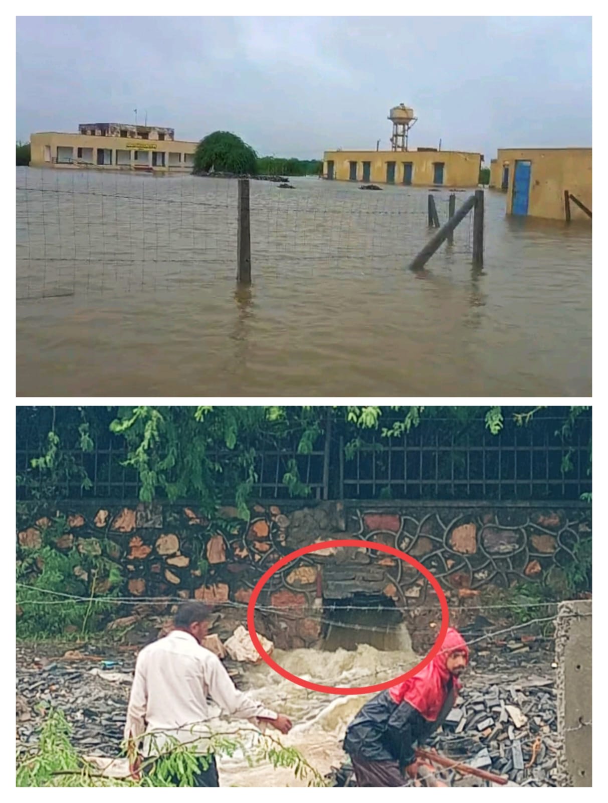 इससे पानी निकलने लगा। सोमवार सुबह दीवार टूटने से तेज रफ्तार से पानी सड़क से बहकर गांव की ओर जाने लगा। इसके चलते देवली गांव की महात्मा गांधी गवर्नमेंट स्कूल में पानी भरा गया। स्कूल एक टापू की तरह बन गई है। वहीं सड़क पर घुटने घुटने तक पानी हो गया है। उधर, देवली गांव का धोलाई सागर बांध लबालब हो चुका है। ऐसे में तालाब की पाळ में सेंध लग सकती है। यदि ऐसा हुआ तो तालाब के आसपास के खेत जलमग्न हो जाएंगे। इसके चलते जेसीबी भी मशीन की मदद से पानी निकालने का रास्ता बनाया जा रहा है।