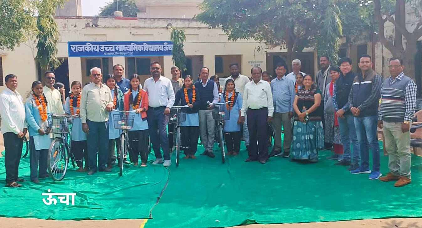 ऊंचा के राजकीय उच्च माध्यमिक विद्यालय में 29 बालिकाओं को साइकिल वितरित की गई। प्रधानाचार्य रीना शर्मा ने बताया कि पिछले वर्ष व इस वर्ष कुल 29 छात्राओ को मुख्यातिथि जहाजपुर पंचायत समिति सदस्य दिनेश माली, पूर्व सरपंच जयसिंह मीणा, राजेश जैन, उप सरपंच प्रभुलाल माली, गजराज सिंह राणावत, खेमराज वर्मा, सुरेश मीणा के आतिथ्य में साइकिल वितरित की गई। कार्यक्रम में पहुंचे अतिथियों का विद्यालय स्टाफ द्वारा माल्यार्पण कर स्वागत किया गया। यहां जयराम मीणा, वार्ड पंच बाबूलाल वर्मा,राजेश शर्मा, दुर्गालाल मीणा, शैतान मीणा सहित थे।