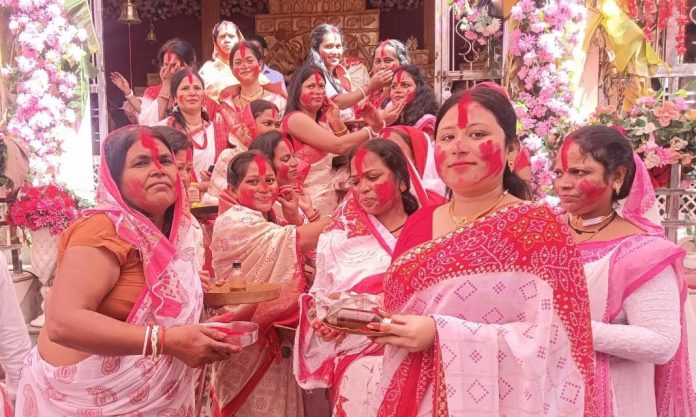 समिति के सलाहकार डॉ. अशोक मंडल ने बताया कि दुर्गा पूजा के अंतिम दिन सिंदूर खेला का विशेष महत्व है, जो पूरे आयोजन को भक्तिमय बना देता है। इसके साथ बंगाली कॉलोनी में सप्तमी से चल रहे दुर्गा पूजा महोत्सव का भी समापन हुआ। इस आयोजन में दुर्गा पूजा कमेटी के अध्यक्ष शंकर सरकार, उपाध्यक्ष प्रवीण मंडल, सचिव अमर दास, बाबू विश्वास, उपसचिव शंकर पोद्दार, राजू विश्वास, पुजारी प्रसाद चक्रवर्ती, रमेन पाल तथा मां आरती में रोबिन भक्त सहित मौजूद थे। शुक्रवार को विसर्जन शोभायात्रा आयोजित होगी।