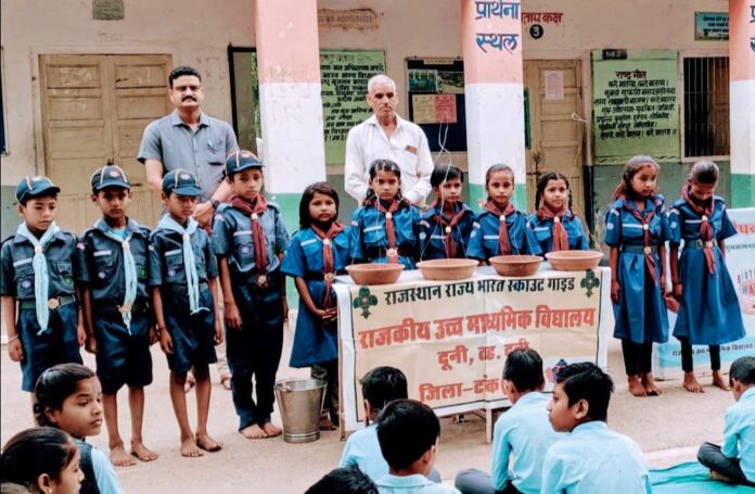 Deoli News 6 अप्रैल (दैनिक ब्यूरो नेटवर्क) पीएम श्री राजकीय उच्च माध्यमिक विद्यालय दूनी में शनिवार को पंचायत प्रारंभिक शिक्षा अधिकारी भंवरलाल कुम्हार की प्रेरणा से स्काउट के नन्हे कब और बुलबुल टीम ने शनिवार को पक्षियों के लिए परिंडे बांधे।