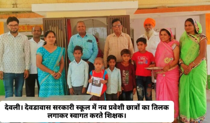 राऊमावि देवडावास में प्रवेश उत्सव के तहत बालकों के तिलक लगाकर व पुस्तक, पेन्सिल देकर स्वागत किया।