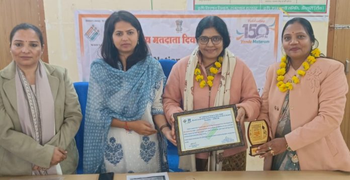 दरअसल शैक्षणिक सत्र 2025-26 के दौरान निर्वाचन साक्षरता एवं विशेष गहन पुनरीक्षण कार्यक्रम संबंधी गतिविधियों का सफल संपादन करते हुए मतदाता जागरूकता के क्षेत्र में उल्लेखनीय योगदान के लिए यह सम्मान दिया गया। कार्यालय निर्वाचक रजिस्ट्रीकरण पदाधिकारी देवली उनियारा में आयोजित समारोह में उक्त सम्मान एसडीओं पूजा मीना द्वारा विद्यालय की प्रधानाचार्य वसुधा शर्मा व निर्वाचन साक्षरता क्लब प्रभारी रिंकू पंचोली को सौपा गया।
