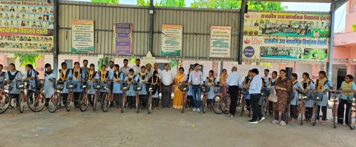 Deoli News 6 अप्रैल (दैनिक ब्यूरो नेटवर्क) पीएम श्री राजकीय उच्च माध्यमिक विद्यालय देवली में राज्य सरकार की नि:शुल्क साइकिल वितरण हुआ।
