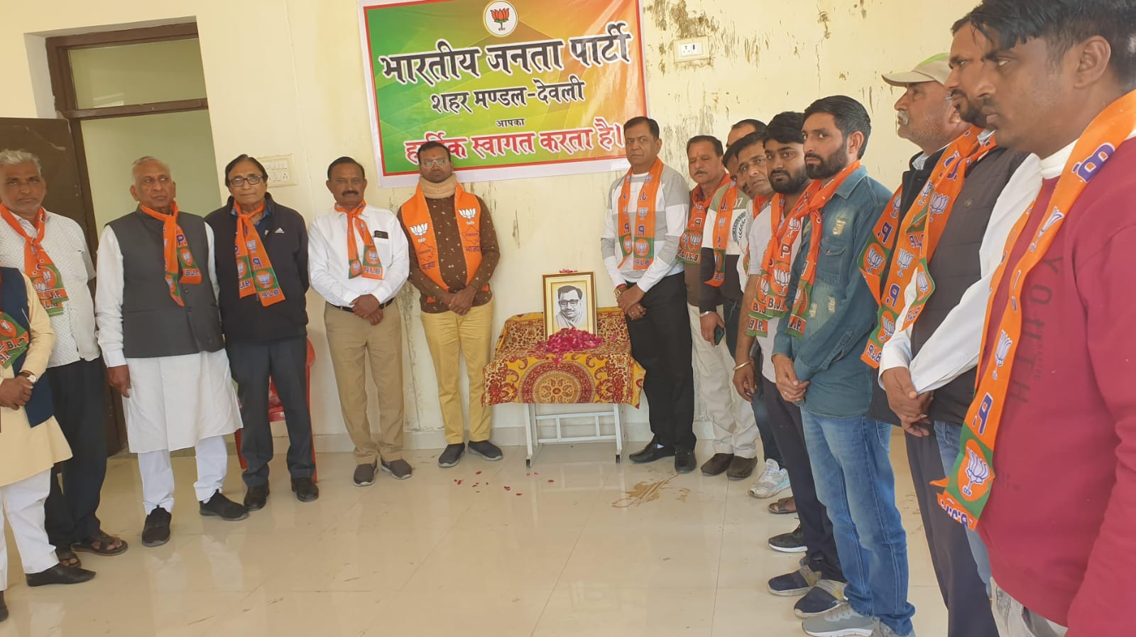 Deoli News 11 फरवरी (दैनिक ब्यूरो नेटवर्क) भाजपा शहर मंडल देवली की ओर से मंगलवार को पं दीनदयाल उपाध्याय की पुण्य तिथि पर पुष्पांजलि अर्पित की गई। इस अवसर पर सभी कार्यकर्ताओं ने उपाध्याय के चित्र के समक्ष पुष्प अर्पित कर श्रद्धांजलि अर्पित दी।