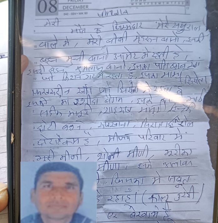 मृतक ने आत्महत्या से पूर्व ऑडियो में कहा कि वह इन सबसे परेशान हो चुका है। अब उसे कोई रास्ता नहीं मिल रहा है। उसने आत्महत्या के लिए अपने बच्चों व सास, ससुर से माफी मांगी और कहा कि गुस्सा बहुत आ रहा है। इच्छा हो रही है कि सबको मार के जाऊं। लेकिन अल्लाह ने मुझे ताकतवर नहीं बनाया। ऑडियो में कहा कि वह हर 10 माह में सऊदी अरब से छुट्टी में आता था। लेकिन उस पत्नी लड़ाई झगड़ा करती थी। इससे वह तंग आ चुका है तथा वह लड़ाई झगड़ा क्यों करती थी। इसका भी उसे मालूम है। मृतक ने ऑडियो में कहा कि बच्चों की लाइफ खराब की है और सुसाइड नोट में लिखा कि इन सब का हिसाब मौत के दोषियों पर डालना, मेरे बच्चों पर नहीं। मृतक ने सुसाइड नोट में अपनी दूसरी पत्नी मेहरून बानो, आमेर निवासी बहन मुन्नी बानो, किशनगढ़ निवासी बड़ी बहन मुमताज, मां मामा समेत लोगों को अपनी आत्महत्या के लिए दोषी ठहराया है। इसके अलावा अन्य लोगों के भी सुसाइड नोट में नाम लिखे हैं।