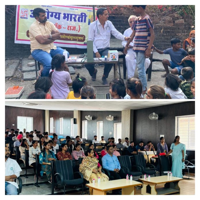 आरोग्य भारती सांगानेर विभाग के संयोजक व वरिष्ठ आयुर्वेद चिकित्सा अधिकारी डॉ. पी.एल. जांगिड़ एवं उनकी टीम ने बस्ती के लोगों व बच्चों का स्वास्थ्य परीक्षण कर हीमोग्लोबिन, ब्लड शुगर और बीपी सहित सामान्य जांचें निःशुल्क की। अस्वस्थ लोगों को आवश्यकतानुसार औषधियां वितरित की गईं और उन्हें दिनचर्या, ऋतुचर्या सहित स्वस्थ जीवनशैली अपनाने हेतु प्रेरित किया गया। डॉ. जांगिड़ ने रोगानुसार योग-प्राणायाम और स्वच्छता के महत्व की जानकारी देते हुए स्वस्थ राष्ट्र निर्माण में भागीदारी निभाने का आह्वान किया। यहां आरोग्य भारती के लक्ष्मीकान्त पारीक, दिनेश जैन और अभिषेक ने सहयोग किया।