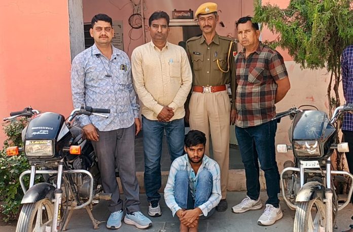 पुलिस ने बताया कि आरोपी रोहित उर्फ बिट्टू पुत्र किशन लाल दरोगा निवासी कीरो की घाटी हिंडोली जिला बूंदी है। जिसने दो लोगों की यहां देवली से बाइक चुराई थी। पुलिस के अनुसार देवीखेड़ा निवासी गोपाल लाल पुत्र जोगाराम गुर्जर ने पिछले वर्ष 11 जुलाई को पटेल नगर देवली से बाइक चुराने की रिपोर्ट दी थी। इसी तरह साकेत कॉलोनी निवासी प्रेमकुमार पुत्र केसर लाल ने गत वर्ष 27 जुलाई को घर के बाहर से बाइक चोरी होने की रिपोर्ट दर्ज कराई थी।