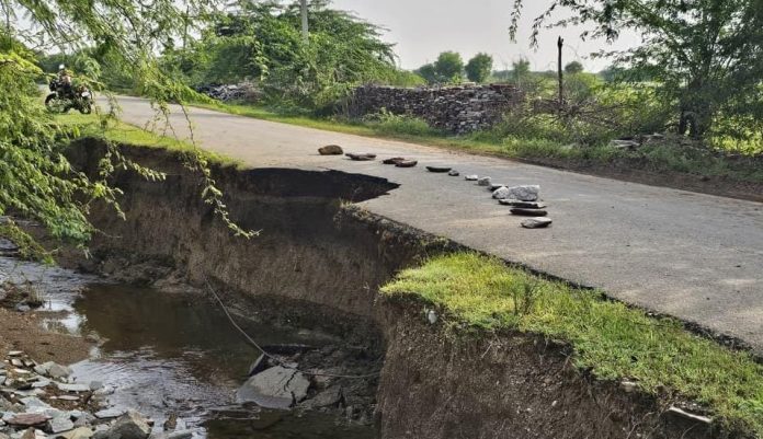 दरअसल क्षेत्र में हो रही लगातार बारिश के चलते जगह-जगह सड़के टूट गई है। चांदसिंहपुरा से टोकरावास ग्राम पंचायत मुख्यालय पर जाने वाली डामरीकृत सड़क पानी के तेज बहाव में बह गई। रात के अंधेरे में इस मार्ग से गुजरने वाले वाहन चालकों के साथ कभी भी हादसा हो सकता है। इसे लेकर ग्रामीणों ने जिला कलक्टर को शिकायत दर्ज कराई है।