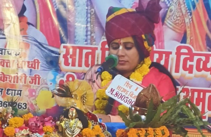 प्रिया किशोरी ने कहा कि श्रीकृष्ण भगवान जब हस्तिनापुर पहुंचे, तब दुर्योधन ने उनके लिए 56 भोग तैयार करवाए। लेकिन भगवान ने विदुर काका के घर पहुंचकर विदुरानी के हाथ से केले के छिलके खाए। इससे पूर्व उन्होंने भोले बाबा द्वारा पार्वती को सुनाई गई अमर कथा के बारे में विस्तार से बताया। शिव बाबा द्वारा पार्वती को जिस गुफा में अमर कथा सुनाई गई। आज उसी गुफा को अमरनाथ गुफा कहते हैं। उन्होंने सुखदेवजी महाराज की जन्म का वृतांत सुनाया। महाभारत के अर्जुन के पुत्र अभिमन्यु व उत्तरा के पुत्र राजा परीक्षित की कथा सुनाई। कथा में बताया कि अश्वत्थामा द्वारा गर्भस्थ शिशु पर ब्रह्मास्त्र चलाया गया। लेकिन भगवान कृष्ण ने रक्षा की। वही बालक कालांतर में राजा परीक्षित बने। राजा परीक्षित का हीरावती के साथ विवाह, जन्मेजय जैसे चार पुत्र, जंगल में कलयुग का मिलना। कलयुग द्वारा रहने का स्थान मांगने की कथा कही। उन्होंने कहा कि शुकदेवजी कहते हैं कि कलयुग झूठ, पाप की कमाई, सोने में रहता हैं, मांस, मदिरा खाने वाले तथा ताशपत्ती खेलने वाले के सिर पर कलयुग सवार होता है।