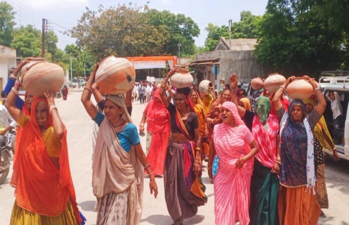 Jahazpur News 15 जुलाई (आज़ाद नेब) पानी, बिजली, नरेगा, आम जनता के साथ भेदभाव, सरकारी योजनाओ का दुरुपयोग किए जाने को लेकर पीपलूंद उप सरपंच सावन टांक के नेतृत्व में सोमवार को ग्रामीणों महिलाओं ने मटकियां लेकर उपखंड कार्यालय पर धरना प्रदर्शन करते हुए ज्ञापन सौंपा।