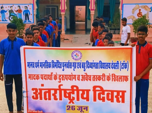 Deoli News 27 जून (दैनिक ब्यूरो नेटवर्क) मानव धर्म बहुदिव्यांगता विद्यालय एवं मानव धर्म मानसिक विमंदित गृह देवली में मादक पदार्थों के दुरूपयोग व अवैध तस्करी के खिलाफ अंतर्राष्ट्रीय दिवस मनाया गया। रालसा का एक्शन प्लान के अनुसार दिव्यांग छात्र-छात्राओं ने रैली निकालकर नशीली दवाओं के नुकसान के बारे में आमजन को जागरूक किया।
