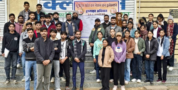 Deoli News 7 जनवरी (दैनिक ब्यूरो नेटवर्क) देश में एक समय पर एक साथ चुनाव के लिए स्टूडेंट फॉर वन नेशन वन इलेक्शन हस्ताक्षर अभियान देवली के राजकीय महाविद्यालय सहित विभिन्न संस्थाओं में जनजागरण अभियान शुरू किया गया।
