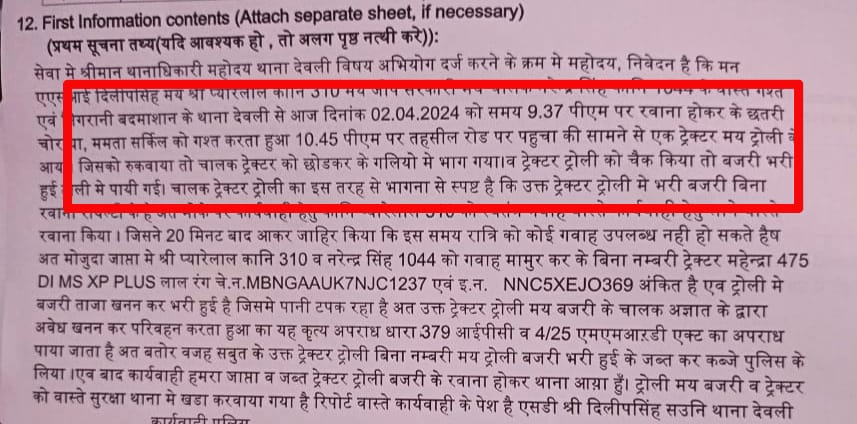 उल्लेखनीय है कि बीती रात देवली थाने के दो पुलिसकर्मी बाइक पर सवार होकर एक बजरी की ट्रैक्टर ट्राली को एस्कॉर्ट (मार्ग रक्षा) कर रहे थे। यह ट्रैक्टर ट्रॉली विवेकानंद कॉलोनी सीआईएसएफ लिंक रोड के समीप रुकी। जहां एक मीडियाकर्मी ने उक्त मामले को अपने कमरे में कैद किया। जिसमें मीडियाकर्मी के साथ पुलिसकर्मियों की बहस, बजरी से भरी ट्रैक्टर ट्राली, उस पर बैठा हुआ व चालक मौके पर पहुंची देवली पुलिस आदि के वीडियो है। इसके बावजूद देवली पुलिस में मंगलवार रात बजरी चोरी व एमएमडीआर एक्ट के तहत मामला पंजीकृत किया। इसमें यह बताया कि पुलिस ने यह कार्रवाई गश्त के दौरान की है। वहीं चालक गलियों में भाग गया। बाद में ट्रैक्टर ट्राली को पुलिस थाने ले आई। जबकि स्वयं मीडियाकर्मी ने फोन कर पुलिस को जानकारी से अवगत कराया था।