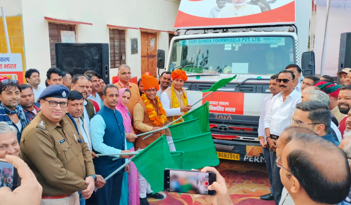 Jahazpur News 16 दिसंबर (आज़ाद नेब) भारत सरकार द्वारा संचालित विभिन्न फ्लैगशिप योजनाओं एवं इनके प्रभावी क्रियान्वयन की जानकारी आम जनता तक पहुंचाने, योजनाओं को प्रत्येक पात्र व्यक्ति तक पहुंचाने व योजनाओं के निर्धारित लक्ष्य प्राप्ति के संबंध में विकसित भारत संकल्प यात्रा का शुभारंभ विधायक गोपीचंद मीणा, लालाराम बैरवा आदि ने हरी झंडी दिखाकर किया।
