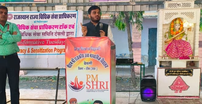 Deoli News 9 अप्रैल (दैनिक ब्यूरो नेटवर्क) पीएम श्री राजकीय उच्च माध्यमिक विद्यालय देवली में गुरुवार को विधिक साक्षरता एवं संवेदीकरण कार्यक्रम आयोजित हुआ। कार्यक्रम का शुभारंभ प्रधानाचार्य वसुधा शर्मा एवं न्यायाधिकारी हर्ष मीणा द्वारा मां सरस्वती के पूजन के साथ किया गया।