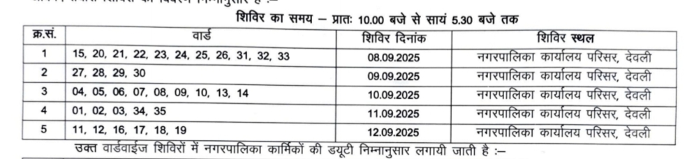 शिविर प्रभारी सहायक अभियंता सुमित कुमार ने बताया कि नगर पालिका देवली द्वारा मुख्य शिविरों के आयोजन से पूर्व तैयारी शिविर का आयोजन 8 से 12 सितम्बर की अवधि में वार्ड वाईज किया जाएगा। जिसमें आमजन की समस्याओं को चिन्हित करने एवं आवेदन प्राप्त किए जाएंगे। उक्त शिविर का समय सुबह 10 बजे से शाम 5.30 बजे तक है।