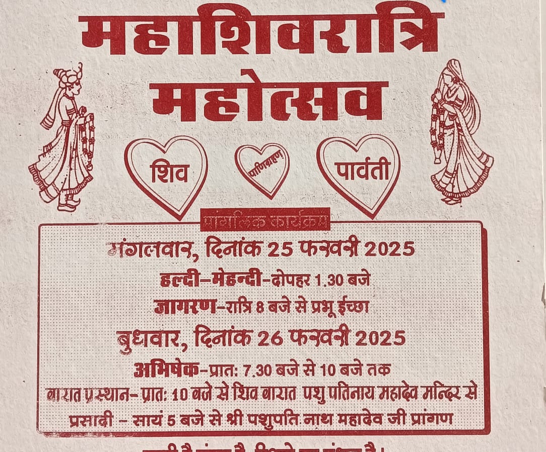 कॉलोनी निवासी व आयोजन से जुड़े उमाशंकर वैष्णव ने बताया कि महाशिवरात्रि महोत्सव को लेकर भगवान शिव और माता पार्वती के शुभ विवाह का कार्ड प्रकाशित किया गया है। उन्होंने बताया कि 25 फरवरी को दोपहर डेढ़ बजे हल्दी और मेहंदी का कार्यक्रम होगा। वहीं इसी रात 8 बजे रात्रि जागरण होगा। जबकि 26 फरवरी को सुबह 7:30 से 10 बजे तक शिव अभिषेक का कार्यक्रम रखा गया है। इसके अलावा सुबह 10 बजे शिव बारात पशुपतिनाथ महादेव मंदिर से रवाना होगी। शाम 5 बजे श्री पशुपतिनाथ महादेव मंदिर परिसर में प्रसादी का आयोजन भी होगा। यह आयोजन शिव मंदिर निर्माण सेवा समिति की ओर से किया जा रहा है। उक्त महोत्सव का हूबहू शादी की तरह कार्ड बनाया गया है।