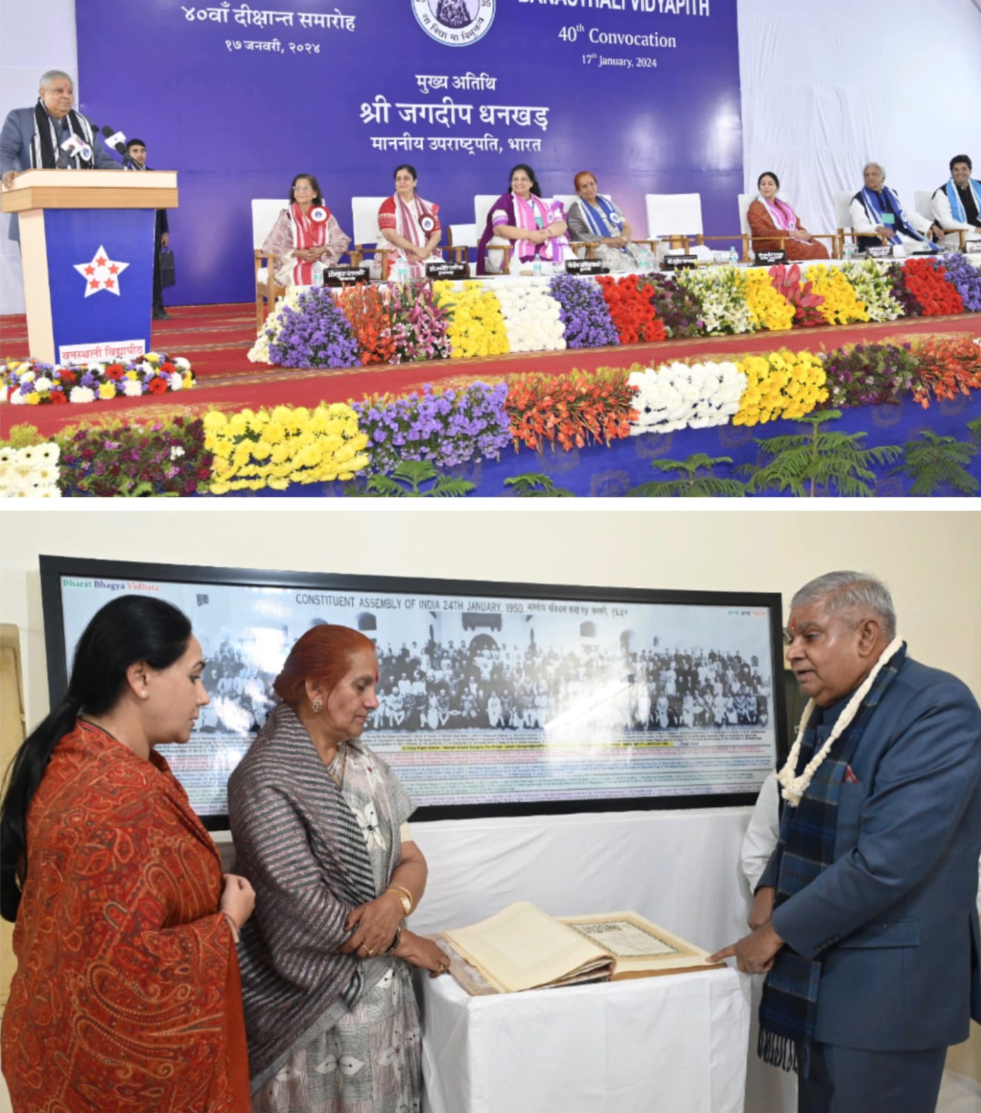 धनखड़ ने सरकार के महिला सशक्तिकरण, आर्थिक प्रगति एवं महिला विकास और उत्थान के लिए चलाई जा रही योजनाओ, बेटी बचाओ, बेटी पढ़ाओं, प्रधानमंत्री उज्ज्वला योजना, हर घर नल जल योजना आदि का उल्लेख किया। उल्लेखनीय है कि उपराष्ट्रपति धनखड़ पत्नी सहित बुधवार को वनस्थली विद्यापीठ के 40वें दीक्षांत समारोह में मुख्य अतिथि के रूप में शामिल हुए। उपराष्ट्रपति एवं प्रदेश की उपमुख्यमंत्री दीया कुमारी भारतीय वायुसेना के विमान से वनस्थली विद्यापीठ पहुंचे। हेलीपैड पर सांसद सुखबीर सिंह जौनपुरिया, जिला प्रमुख सरोज बंसल, विद्यापीठ के अध्यक्ष प्रो. सिद्धार्थ शास्त्री, संभागीय आयुक्त महेश चंद्र शर्मा, पुलिस महानिरीक्षक लता मनोज कुमार, जिला कलक्टर डॉ. सौम्या झा, पुलिस राजर्षि राज वर्मा, उपाध्यक्ष प्रो. ज्योति पारीक, कुलपति प्रो. ईना आदित्य शास्त्री, वनस्थली सेंटर फॉर आर्टिफिशियल के निदेशक डॉ. अंशुमान शास्त्री एवं कोषाध्यक्ष सुधा शास्त्री ने अगवानी की।