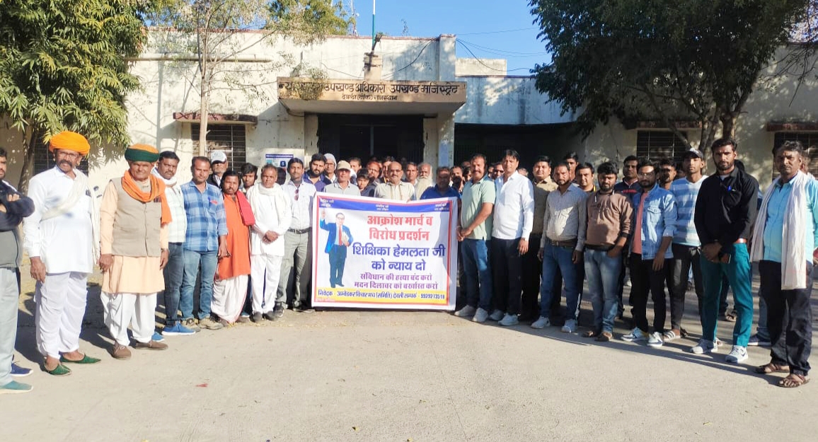 इससे पहले मंच कार्यकर्ता जुलुस के रूप में नारेबाजी करते हुए उपखंड अधिकारी कार्यालय पहुंचे तथा मुख्यमंत्री के नाम ज्ञापन सौपा। ज्ञापन में बताया कि उक्त शिक्षिका को मनमाने तरीके से निलंबित किया गया है। मंच ने शिक्षिका को जल्द से जल्द बहाल करने, शिक्षा मंत्री को बर्खास्त करने व असंवेधानिक आदेश जारी करने वाले जिला शिक्षा अधिकारी के खिलाफ मुकदमा दर्ज करने क़ी मांग क़ी है। वहीं कार्रवाई नहीं होने पर आंदोलन के साथ राजस्थान बंद क़ी चेतावनी दी है। ज्ञापन सौपने में अध्यक्ष राजबहादुर वर्मा, पूर्व अध्यक्ष यादराम मीणा, संगठन मंत्री रमेश मीणा, गोपाल सिंह, गणेश मीणा, लक्ष्मी नारायण मीणा, रामकिशन बैरवा, शिक्षक संघ अम्बेडकर ब्लॉक अध्यक्ष मनीराम वर्मा, सोमाराम बैरवा, अध्यक्ष रैगर समाज समिति बन्नालाल वर्मा, मोहनलाल, महेंद्र बैरवा आदि थे।