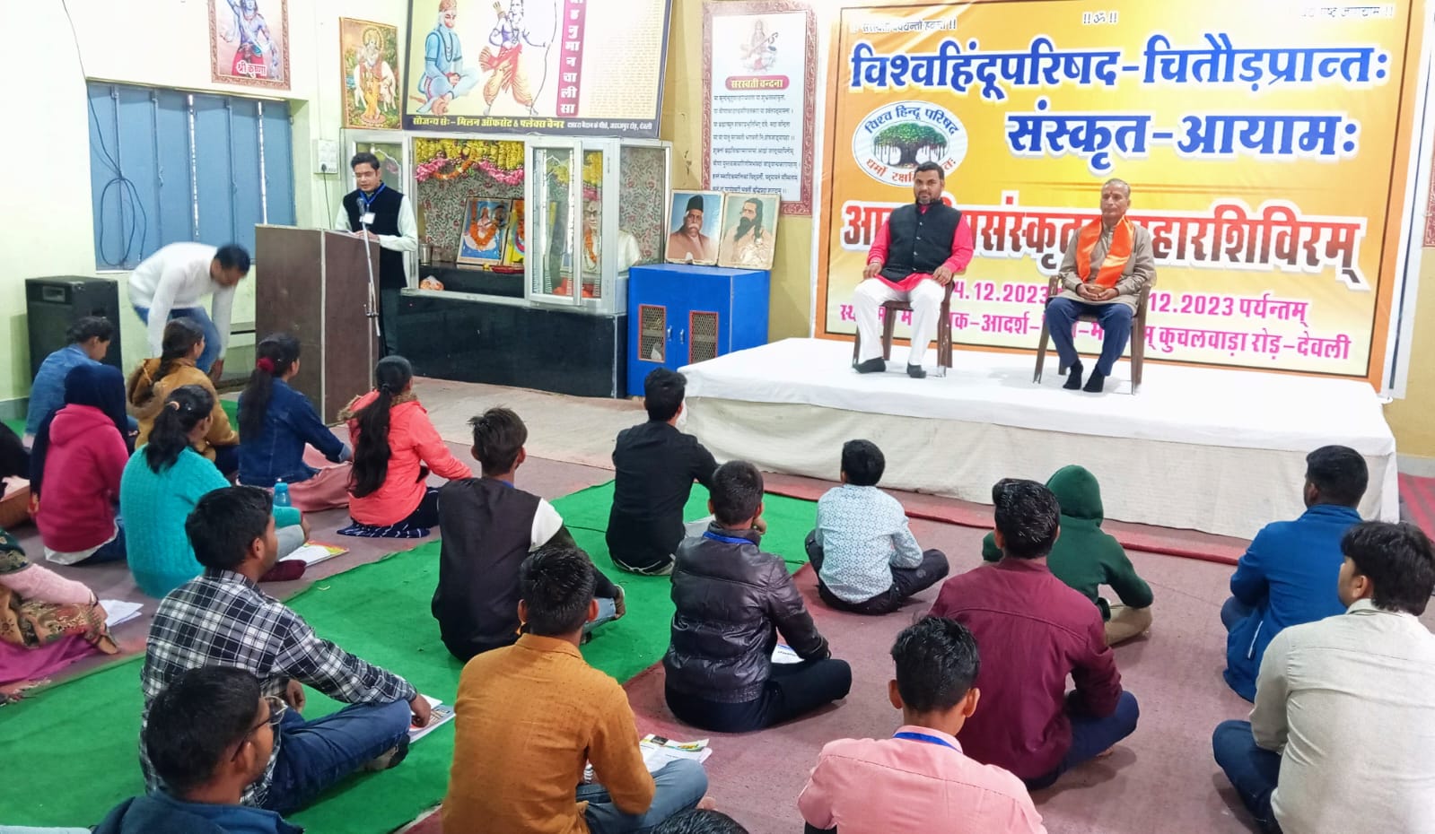 Deoli News 28 दिसंबर (दैनिक ब्यूरो नेटवर्क) यहां आदर्श विद्या मंदिर में विश्व हिंदू परिषद चित्तौड़ प्रांत के संस्कृत आयाम के सात दिवसीय आवासीय संस्कृत व्यवहार शिविर के चौथे दिन मुख्य वक्ता राष्ट्रीय स्वयंसेवक संघ चित्तौड़ प्रांत सहप्रचारक मुरलीधर ने कहा कि संस्कृत भाषा से ही विश्व का पुनरुत्थान होगा।