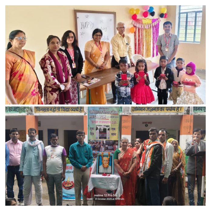 Deoli News 31 अक्टूबर (दैनिक ब्यूरो नेटवर्क) ब्लॉक की विभिन्न स्कूलों में राष्ट्रीय एकता दिवस और सरदार वल्लभभाई पटेल की जयंती के अवसर पर प्रखर राजस्थान 2.0 मेगा पीटीएम का आयोजन किया गया। इस अवसर पर विद्यार्थियों ने अपनी शैक्षिक प्रगति का प्रदर्शन किया और राष्ट्रीय एकता की शपथ ली।