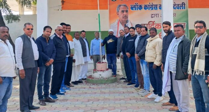 Deoli News 28 दिसंबर (दैनिक ब्यूरो नेटवर्क) अखिल भारतीय कांग्रेस कमेटी के 138 वे स्थापना दिवस के मौके पर गुरुवार को स्थानीय कार्यालय में कार्यक्रम आयोजित हुआ। इस दौरान ब्लॉक अध्यक्ष महादेव मीना व नगर कांग्रेस कमेटी अध्यक्ष विनोद पुजारी ने संयुक्त रूप से पार्टी झंडे का ध्वजारोहण किया।